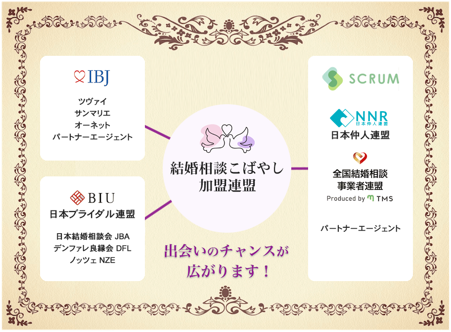 | 加盟団体 | 株式会社IBJ 日本仲人連盟(NNR) 株式会社BIU 日本ライフデザインカウンセラー協会(マル適マークCMS) |